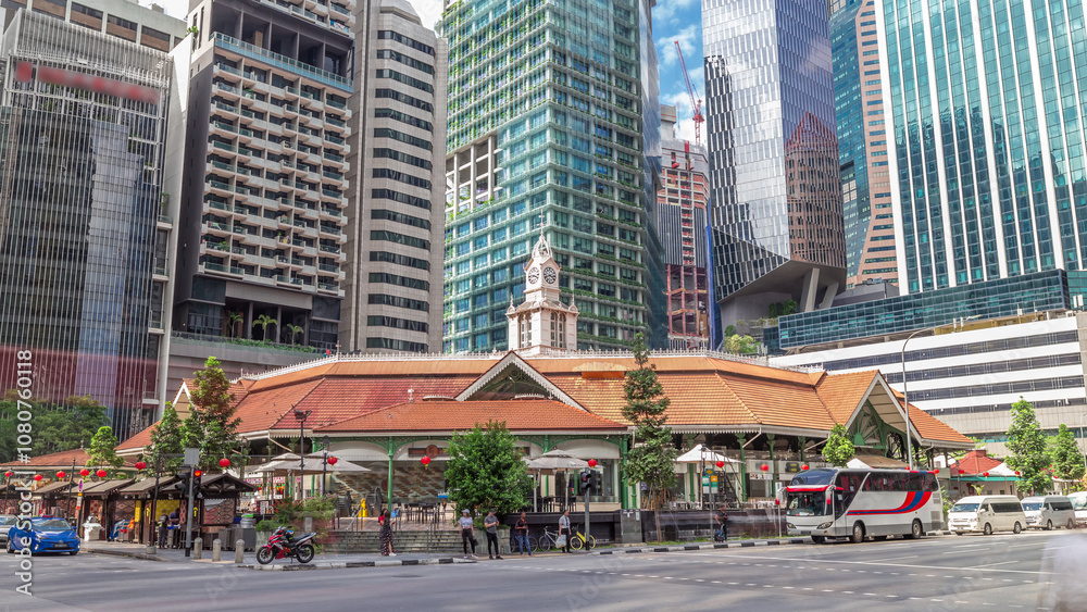 Samolepka Telok ayer market with tall skyscrapers on a background timelapse hyperlapse