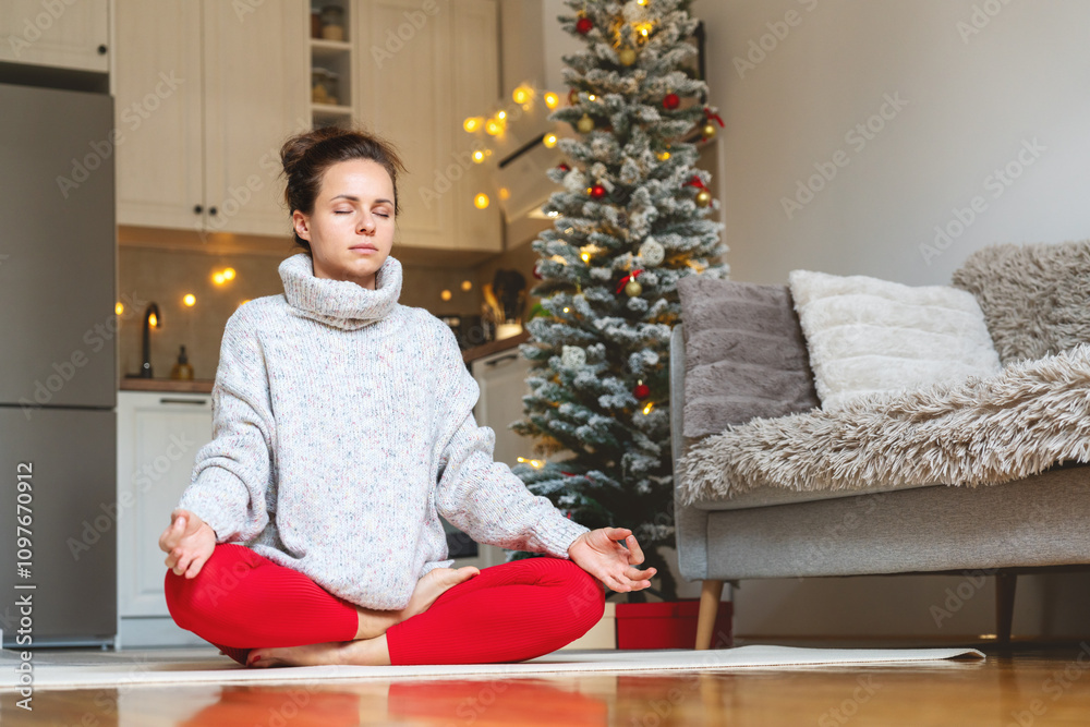 Samolepka Caucasian woman in a knit sweater sitting on the floor at home, meditating during Christmas