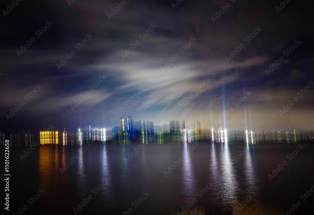 Samolepka long exposure of a riverscape at evening when bluish sky was colorful and city lights are turning on beside the big river