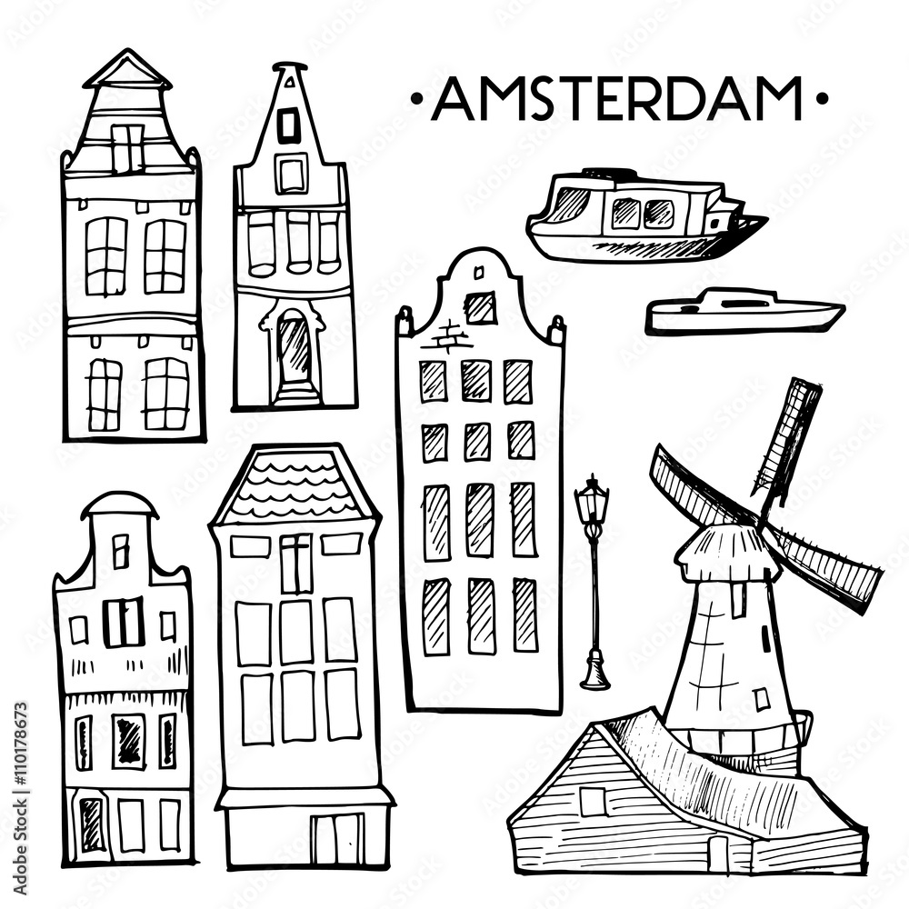 Samolepka Background with hand drawn doodle Amsterdam houses