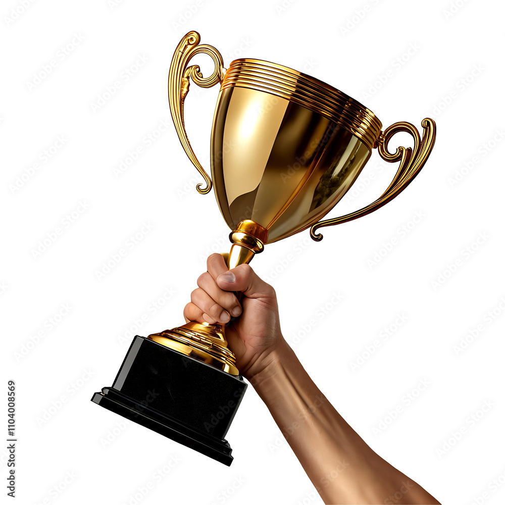 Samolepka Golden trophy held by a hand isolated on transparent background, 3D metallic awa