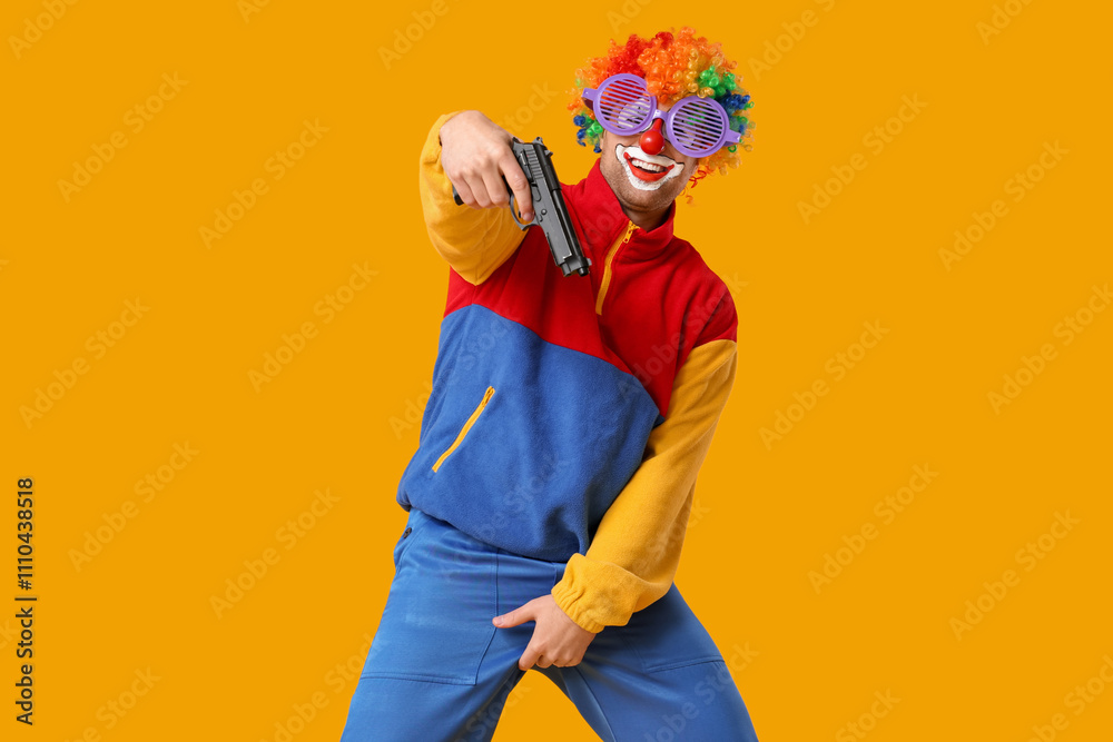 Samolepka Young man as crazy clown with gun on yellow background