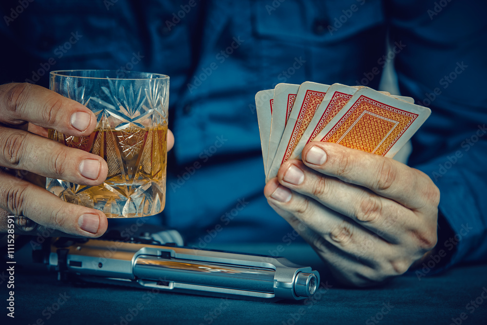 Samolepka gangster with gun holding whiskey glass and playing poker