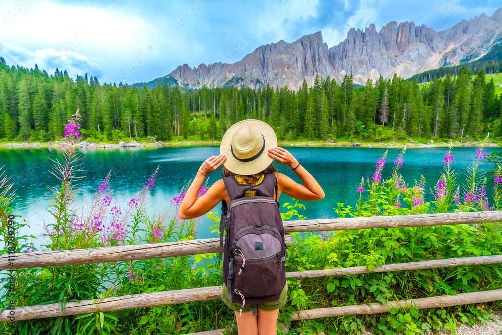 Samolepka Tourist enjoying the breathtaking view of lake carezza and latemar mountain rang