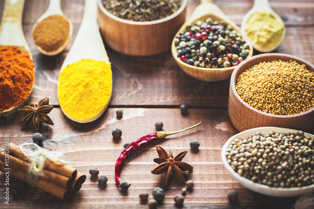 Samolepka Krásné barevné koření v vařečky a misky na starý dřevěný stůl hnědé