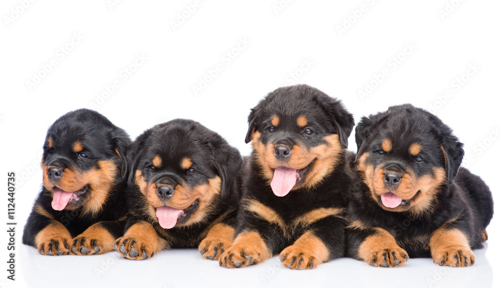 Samolepka Group of puppies Rottweiler lying together in front view. Isolat