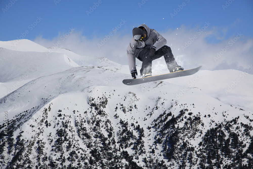 Snowboard rider jumping on mountains. Extreme freeride sport.