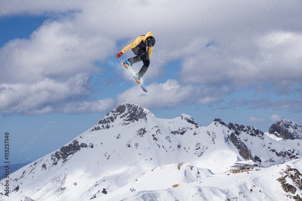 Snowboard rider jumping on mountains. Extreme freeride sport.