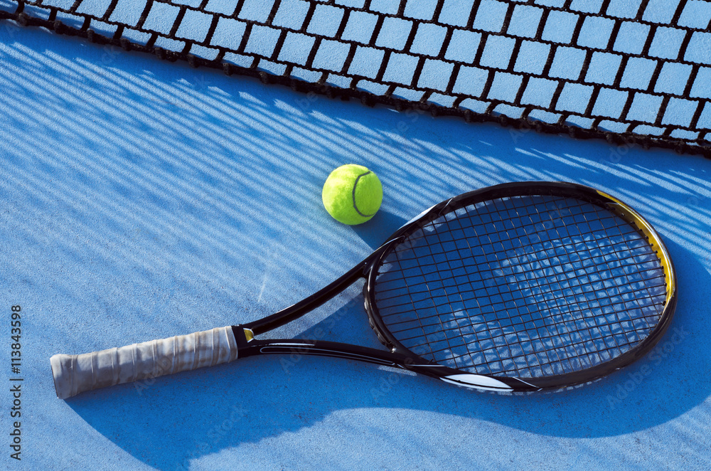 Samolepka Tenisové rakety a míček na modrém asfaltu, net odlévání stín