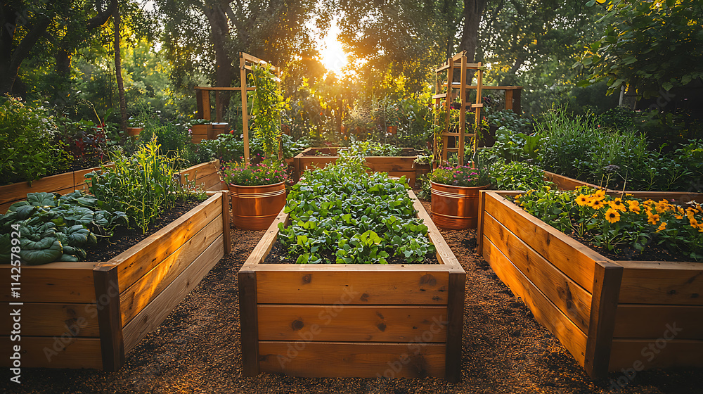 Samolepka Raised garden beds filled soil antique copper planters compost piles and delicat