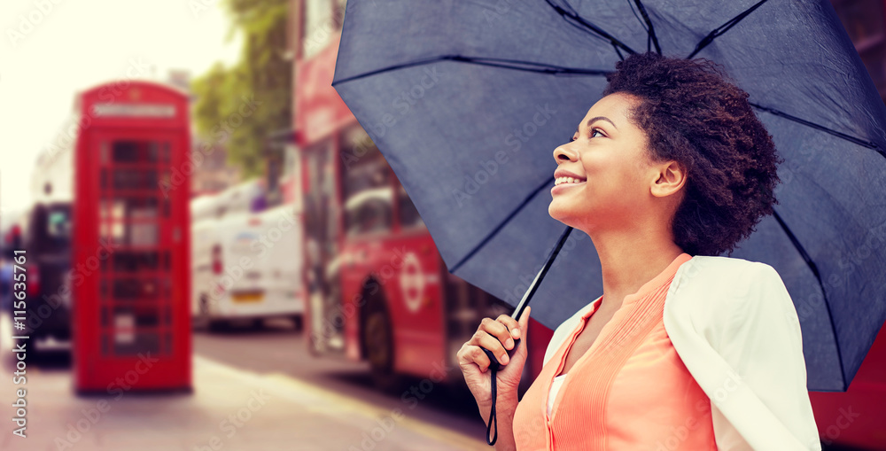 Samolepka happy african woman with umbrella in london city