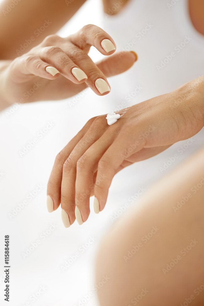 Samolepka Hand Cream. Close Up Of Woman's Hands Applying Lotion On Skin