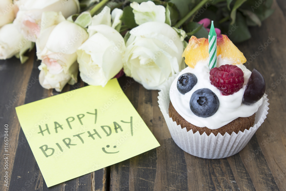 Samolepka Delicious Cupcake with Happy Birthday Notepaper and Flowers