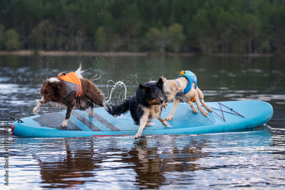 Samolepka Multiple dogs falling off a paddle board