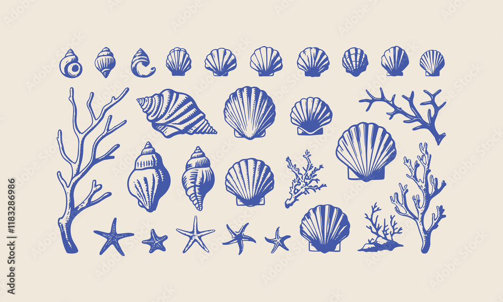 Samolepka Sea life seamless pattern with shell and starfish of illustration, Sea shells vector seamless pattern, Set of sea and ocean underwater animals
