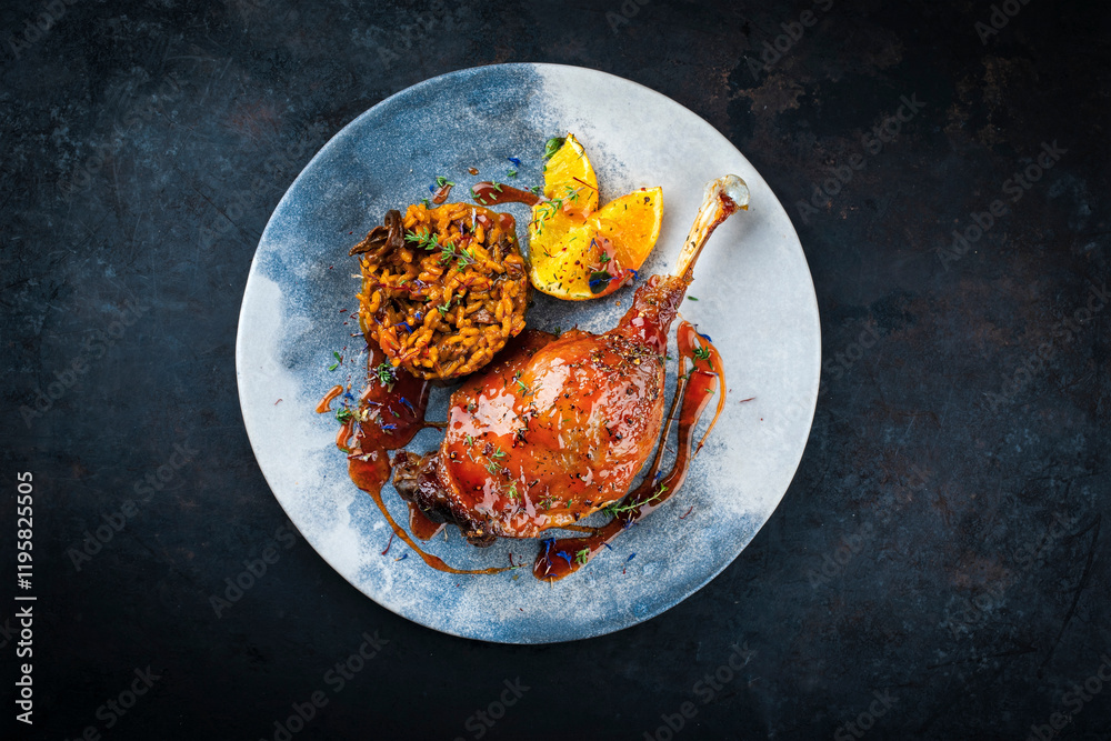 Samolepka Traditional barbecue gourmet duck haunch with mushroom risotto and orange slices