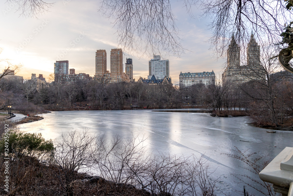 Samolepka The serene beauty of a frozen lake in Central Park, Manhattan, NYC on January 30, 2025, surrounded by the New York City skyline