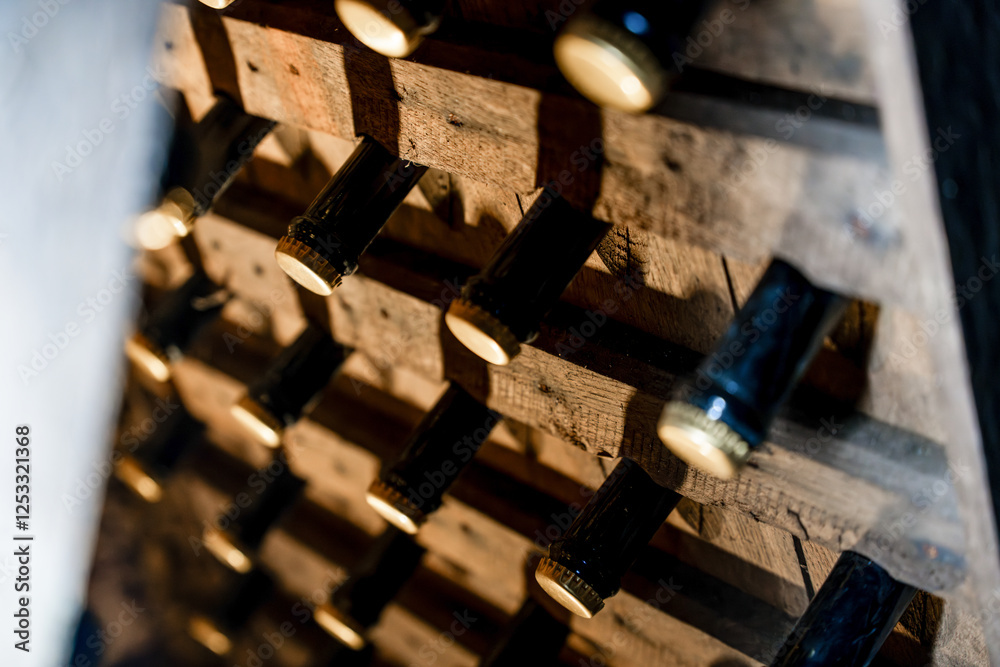 Samolepka Gros plan sur le stockage des bouteilles de vins dans la cave d'une maison de champagne