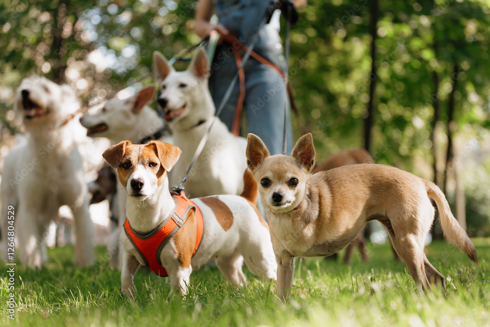 Samolepka young woman Professional dog walker or pet sitter walks a pack of cute dogs of different breeds and rescue dogs on leash on city street