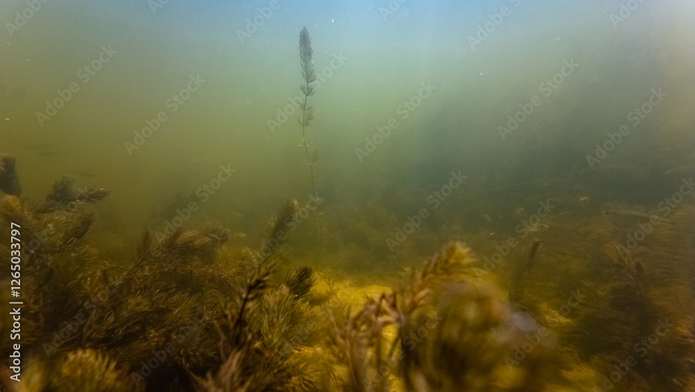 Samolepka hornwort aquatic plant vegetation, fish fry at bottom, silt sediment substrate,