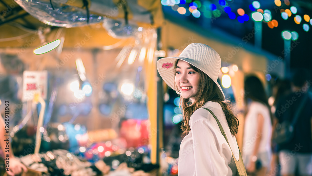 Samolepka Happy traveler asian woman with backpack travel in shopping street night market