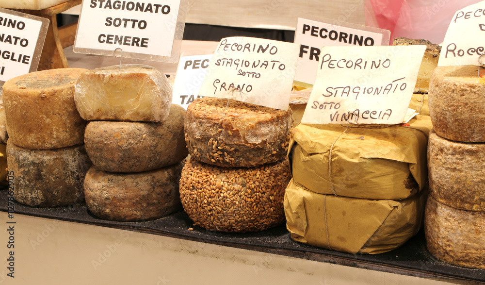 Samolepka many types of pecorino cheese of the Italian written the cheese