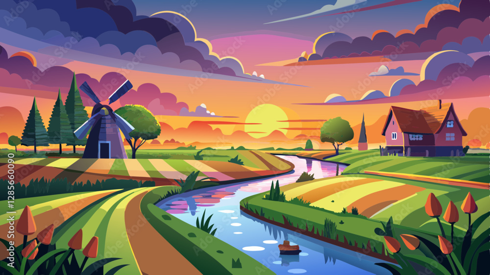 Samolepka The sun sets over the Dutch polder landscape near Gouda, Holland