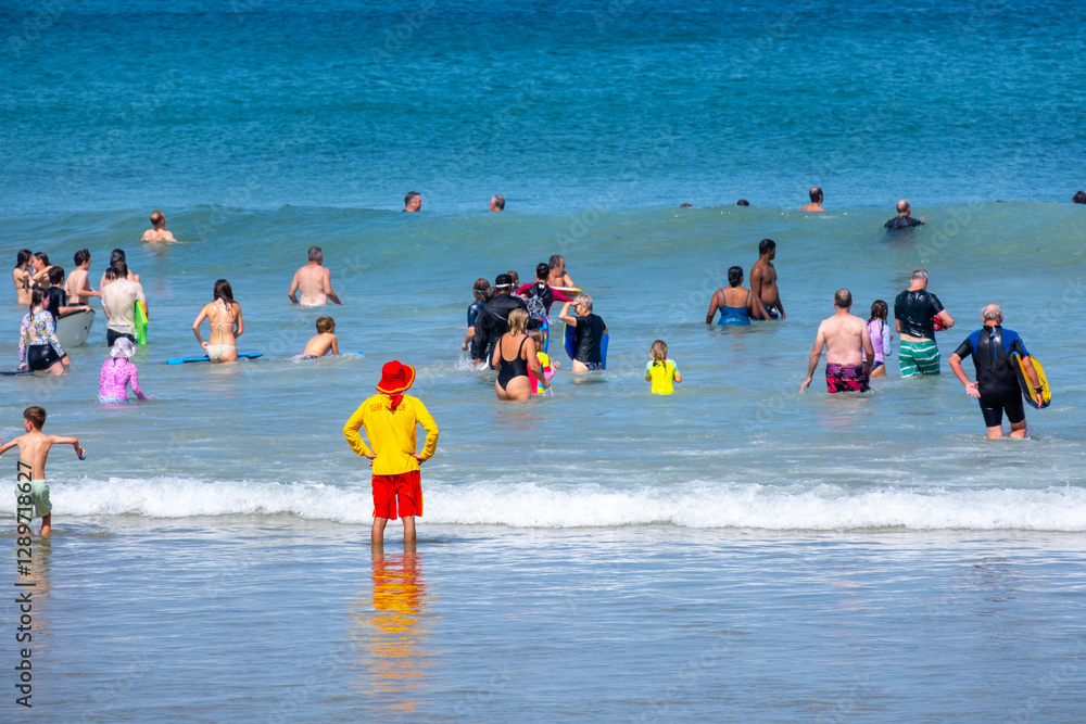 Samolepka A lifeguard in a bright color uniform stands at the beach, watching numerous people or beachgoers swim and enjoying the waves on a summer day at Great Ocean Road