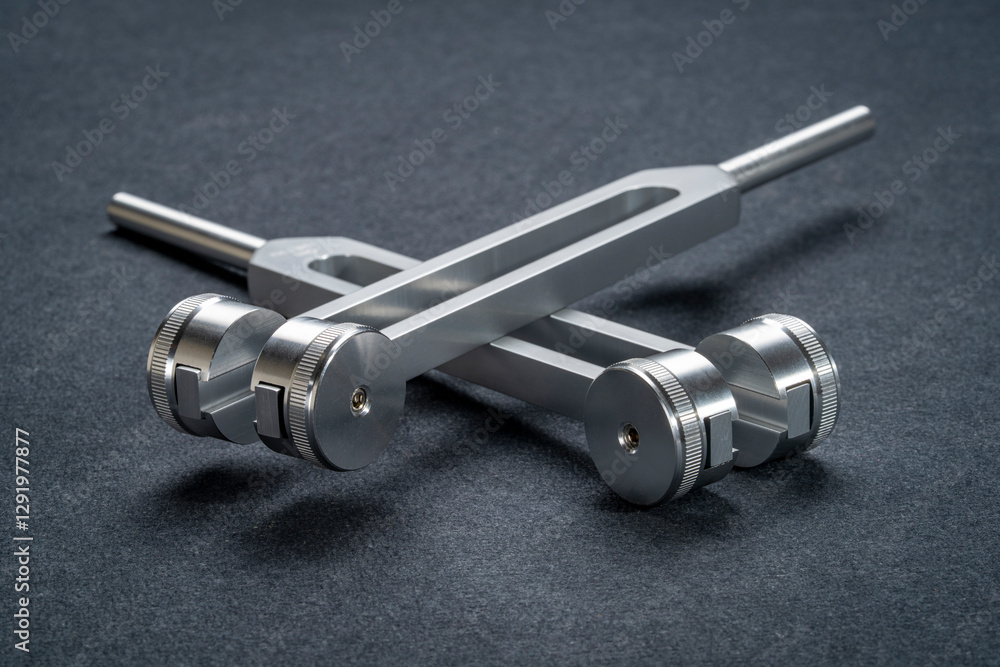 Samolepka Weighted metal tuning forks used for tuning musical instruments, sound therapy, chakra healing or relaxation