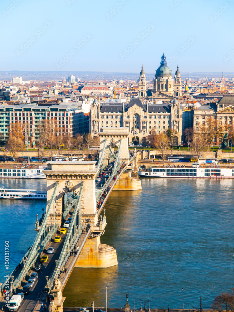 Samolepka Famous Chain Bridge over Danube River, Gresham Palace and Saint Stephen's Basilica view from Buda Castle on sunny autumn day in Budapest, capital city of Hungary, Europe