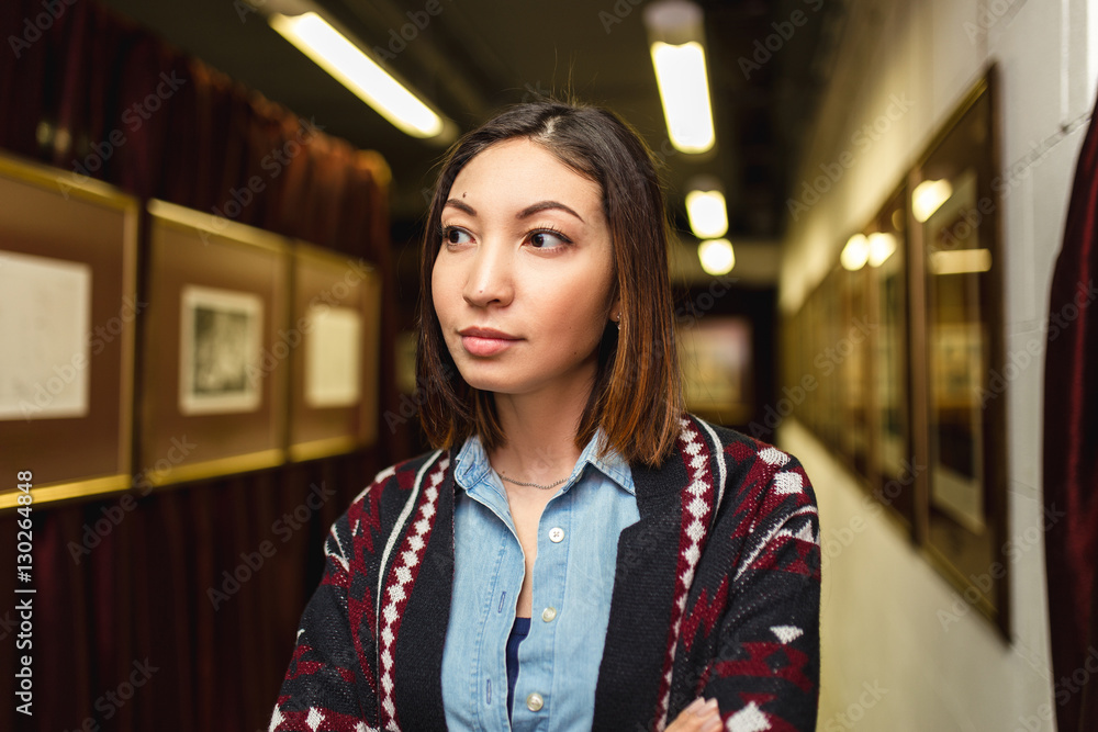 Samolepka Visitor woman looks at the painting in art galery and thinking