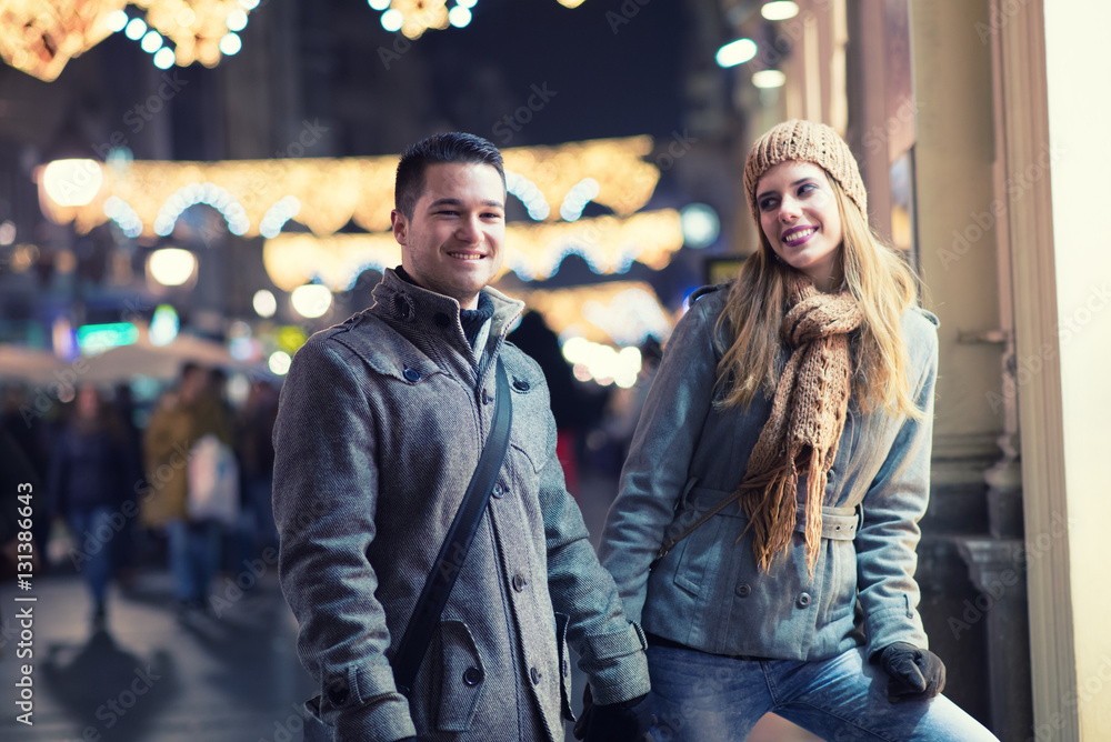 Samolepka Young lovers enjoy on the street at night in the city, the street lights, romance