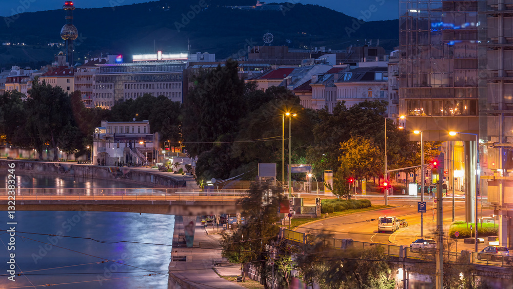 Samolepka Aerial view along the Danube Canal in Vienna night to day timelapse before sunri