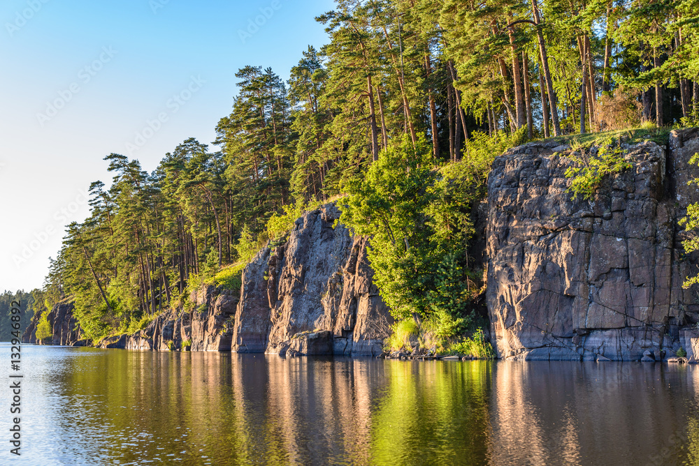 Samolepka Steep rocky coast of the island of Valaam. Evening light. Square