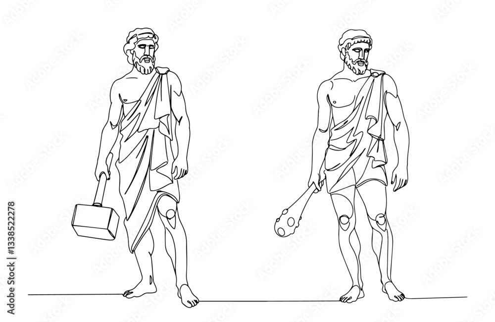 Samolepka hephaestus and hercules standing with hammer and club in greek line drawing