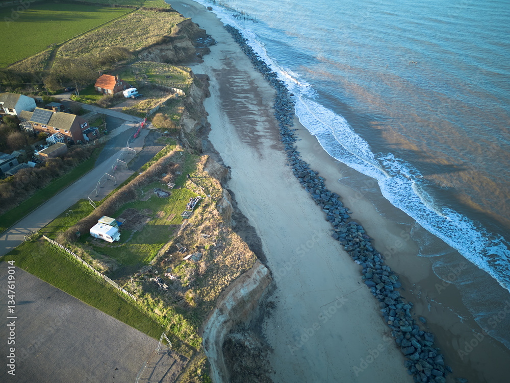 Samolepka aerial view of Happisburgh, Norfolk, UK, a coastline threatened by rising sea le