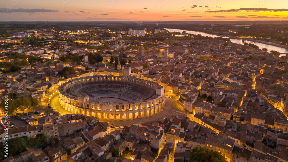 Samolepka Aerial view of the Arles cityscape at night, South of France