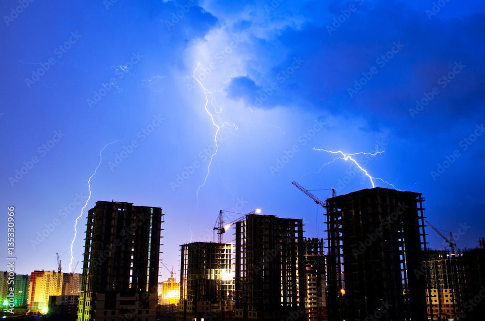 Samolepka Building on a background of lightning thunderstorm industrial city construction