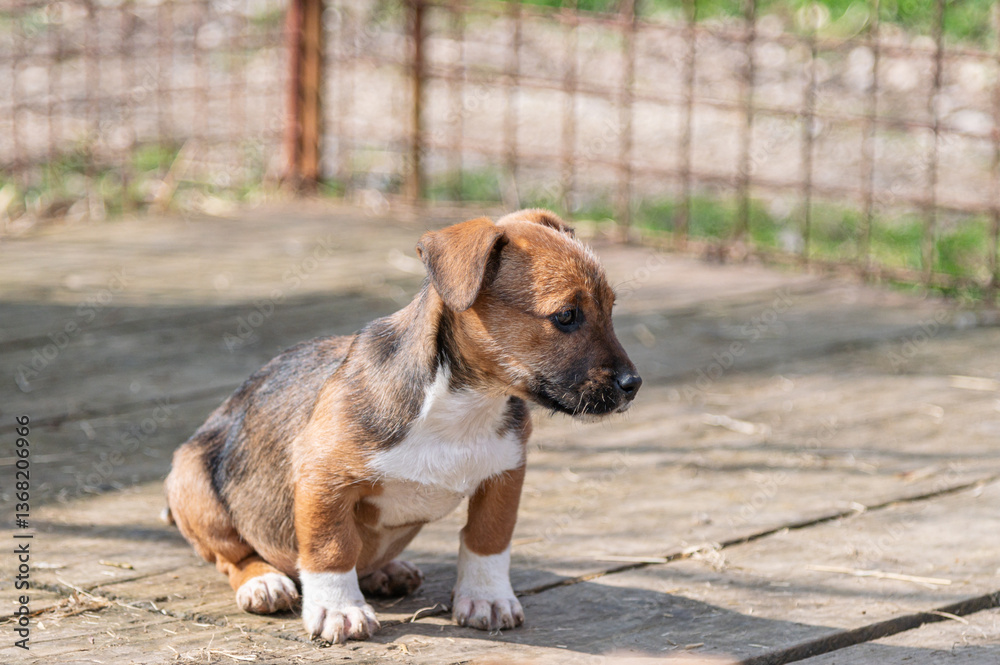 Samolepka Cute rescued puppy in Serbian shelter for homeless dogs on the winter sunny day