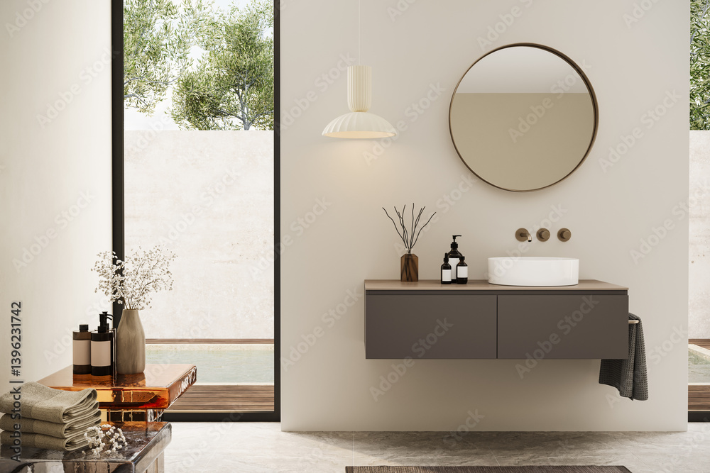 Samolepka Japandi bathroom with earthy brown vanity, organic accessories, and a freestanding bathtub