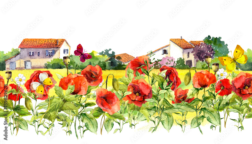 Samolepka Summer poppies flowers, butterflies, provencal houses