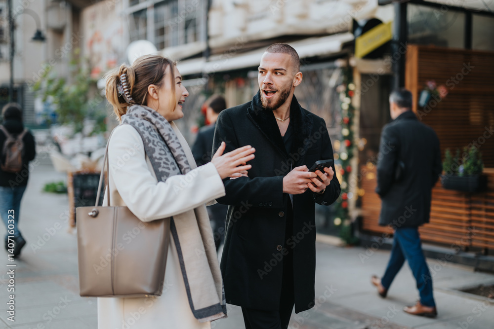 Samolepka Two friends enjoy a meaningful conversation while strolling through a lively urban setting, showcasing connection and camaraderie