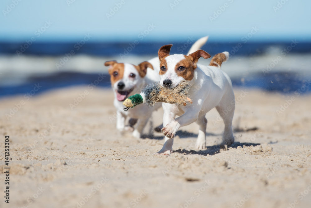 Samolepka jack russell terrier dogs playing with a toy on the beach