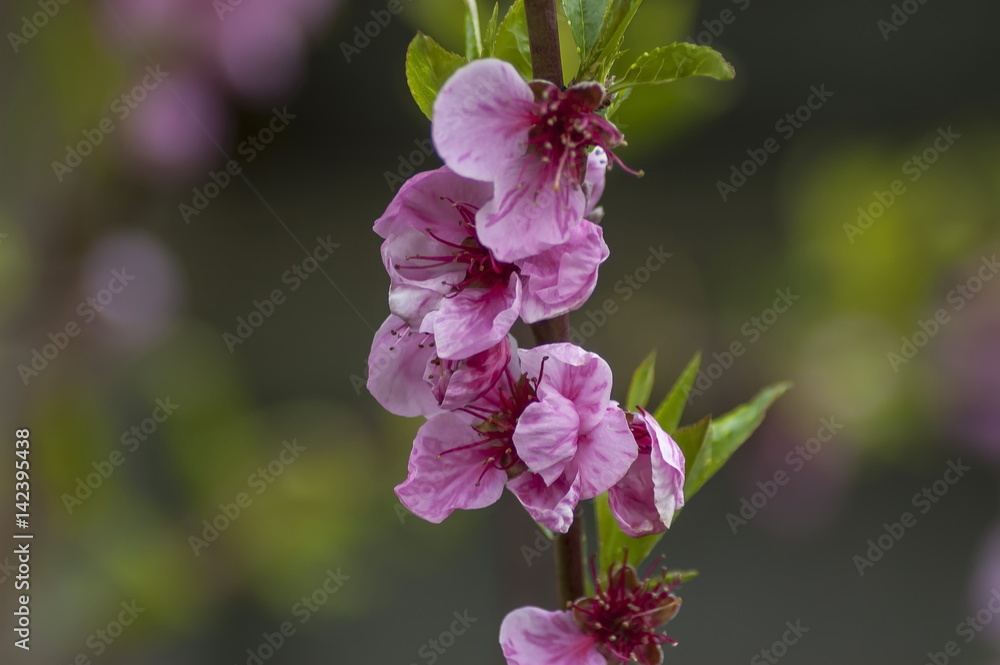 Samolepka Branch with fresh bloom of peach-tree flower or Prunus persica closeup in garde