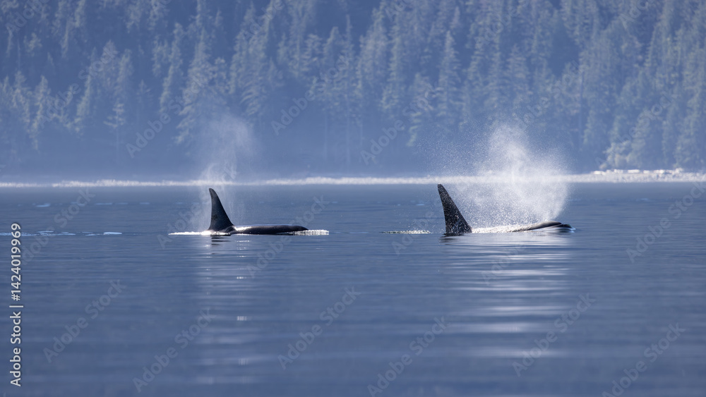 Samolepka Fin of orcas (Orcinus orca), Killer Whale, Knight Inlet, Vancouver Island, British Columbia, Canada