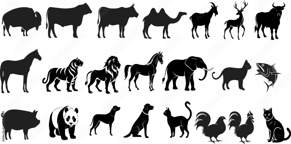 Samolepka Animal silhouette set pets and wildlife with cat, dog, lion, tiger, hen, cock, cow, elephant, panda, fish, horse, camel and more