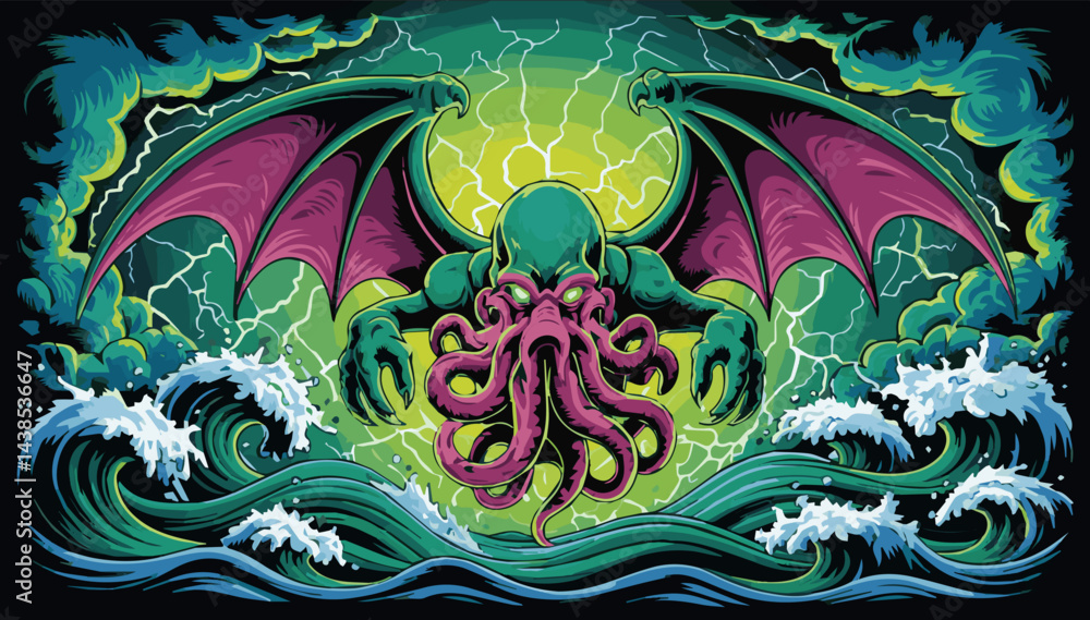 Samolepka A color illustration of a fantastic monster with tentacles and webbed wings emerging from the depths of the sea