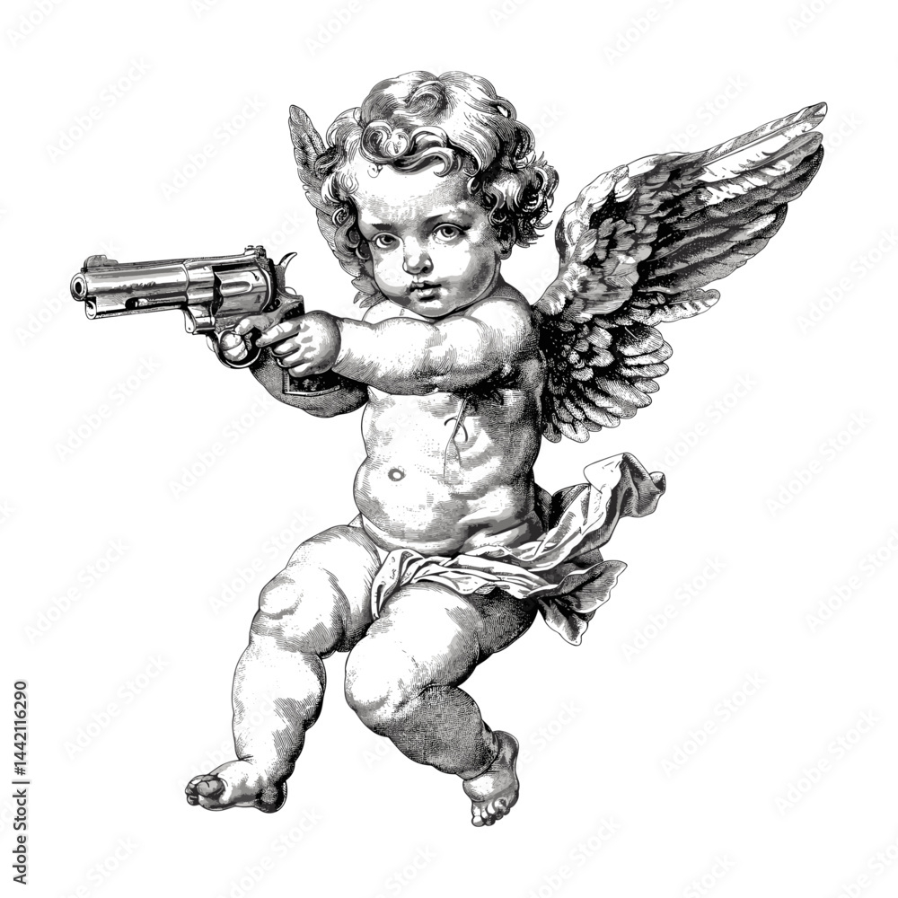 Samolepka Vintage engraving illustration of a cute baby angel cherub with a revolver, black and white hand-drawn outline, trendy emblem, retro tattoo style, old sketch, graphic icon, classic art
