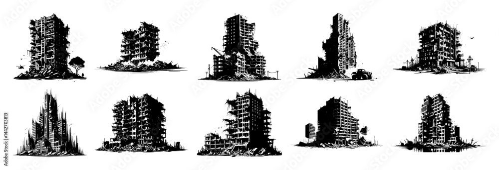 Samolepka ruined buildings set black ink post apocalyptic sketch