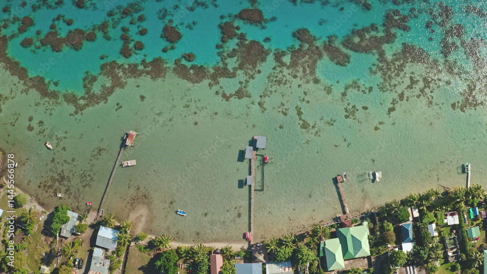 Samolepka Turquoise water coral reef and tropical island coastline, wooden pier stretching to crystal clear shallows of pristine paradise